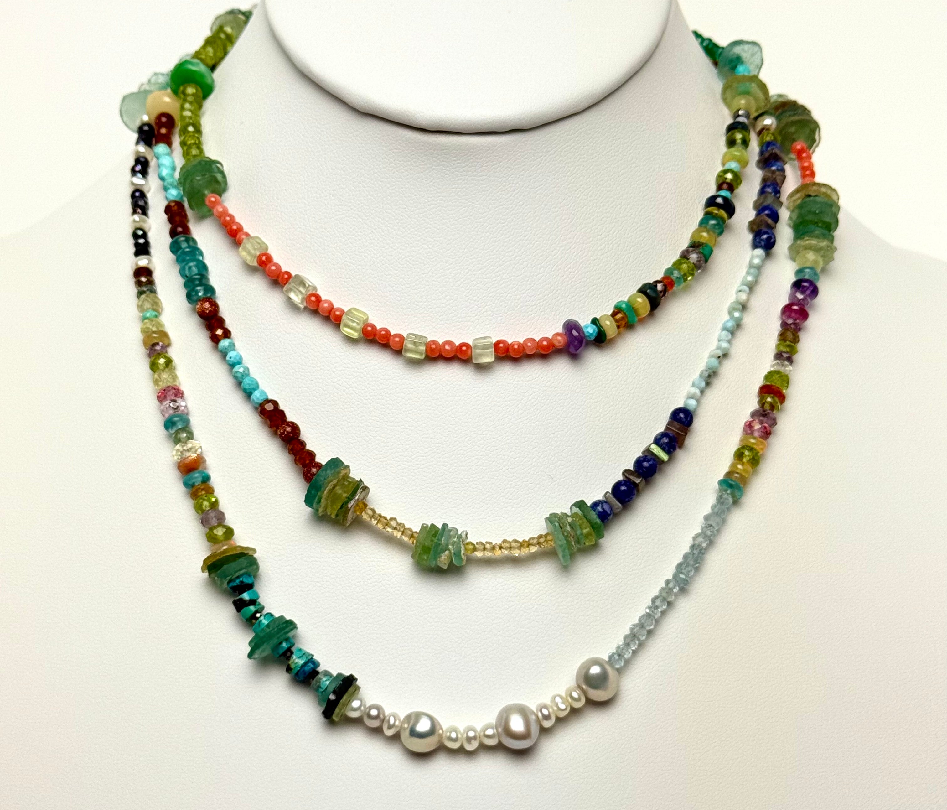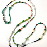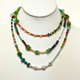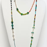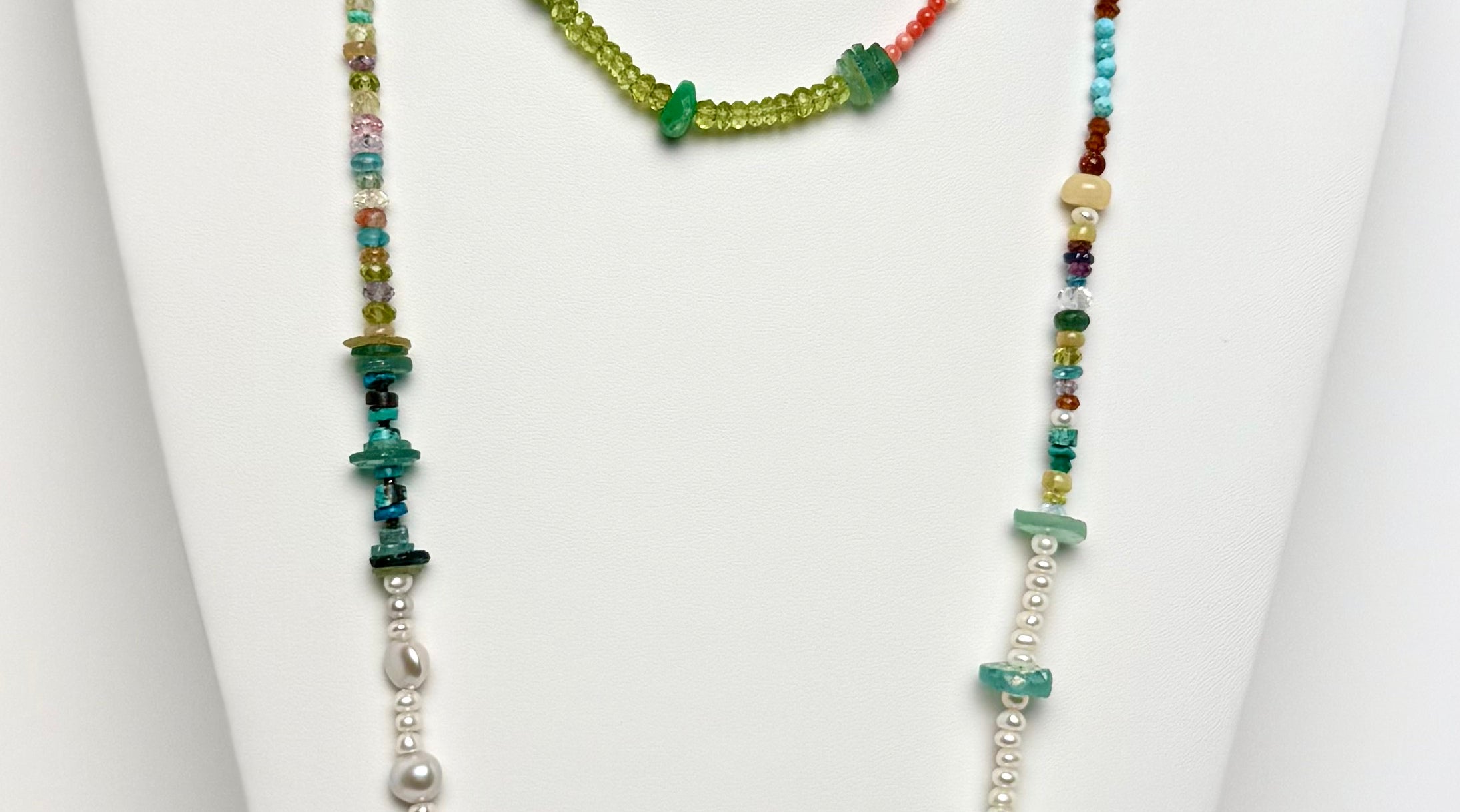 Hand-made, one of kind, rope length (48"), single strand necklace, comprised of various semi-precious stone beads, including amber, amethyst, aquamarine, citrine, labradorite, lapis, larimar, opal, pearl, peridot, and sea glass.
